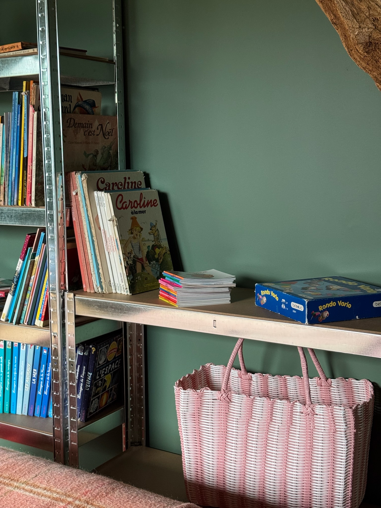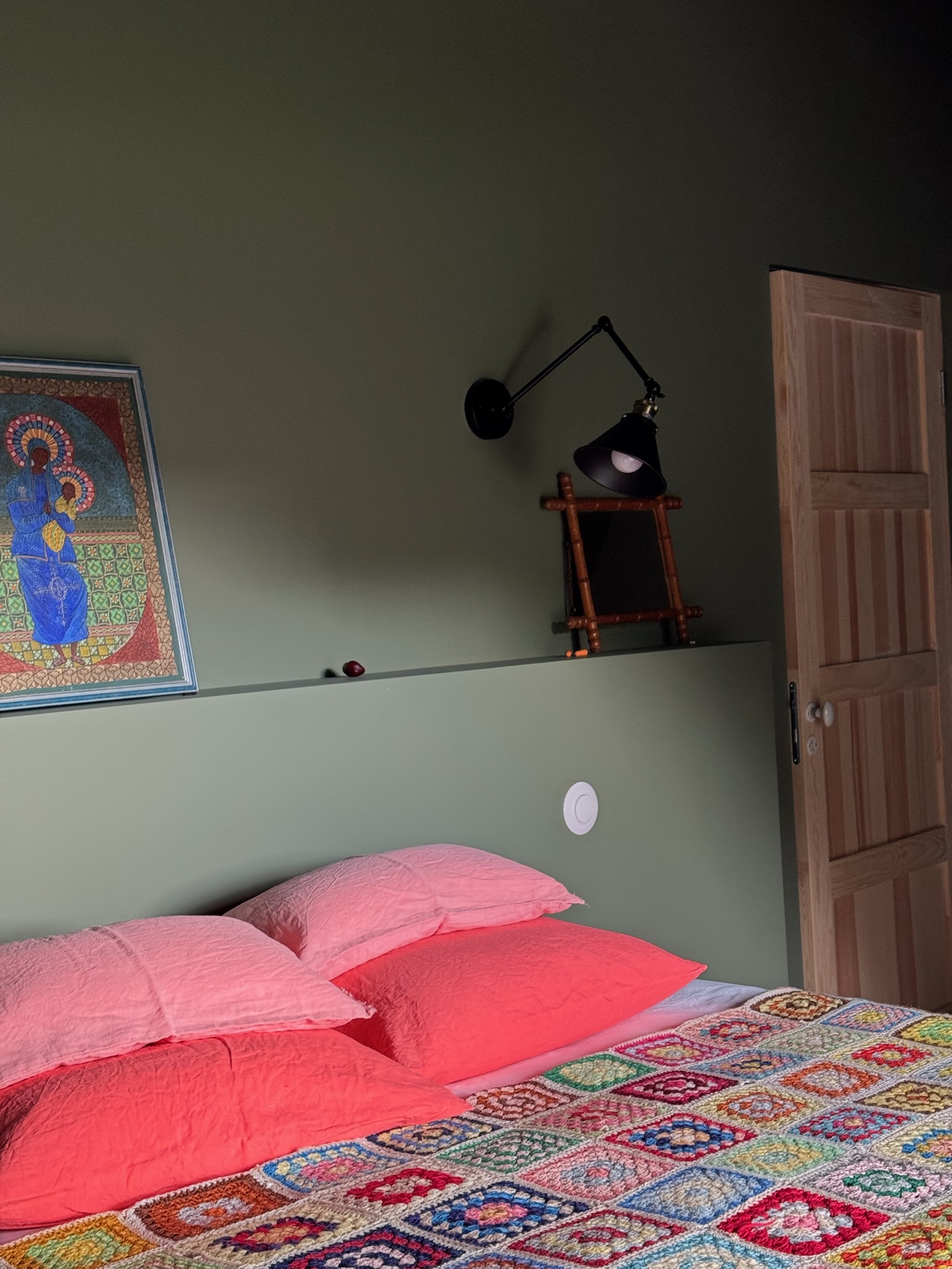 À l’étage, un couloir dessert trois chambres et un grand dortoir, il est de couleur vert forêt, comme la nature environnante,